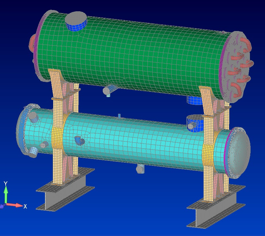 Structural calculation and proof of vessels on legs, saddles, skirts and brackets acc. to AD2000 Merkblätter (local checks acc. to DIN EN 13445 and PD 5500) under consideration of earthquake acc. to SIA 261